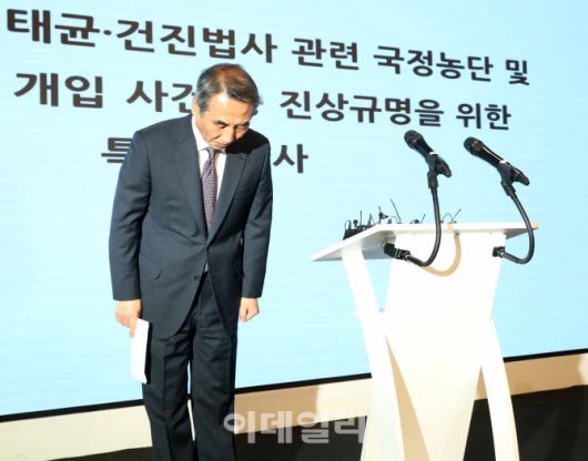 [이데일리 김태형 기자] 민중기 특별검사가 29일 오전 서울 종로구 KT광화문빌딩 특검 브리핑실에서 김건희 여사 각종 의혹 관련 최종 수사 결과 브리핑을 마치고 인사를 하고 있다. |