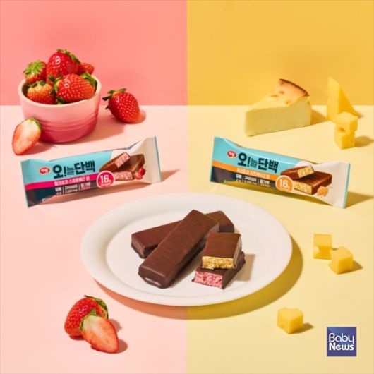 신제품 '오!늘단백 밀크초코 스트로베리바’는 입안 가득 퍼지는 딸기의 상큼한 맛이 특징이며, '밀크초코 치즈케이크바’는 뉴욕 치즈케이크를 고스란히 담은 듯 부드러우면서 고급스러운 풍미를 느낄 수 있다. 두 제품은 동물성인 우유 단백질, 식물성의 대두 단백질, ICBP(분리닭가슴살단백질) 3종의 복합 단백질이 최적의 비율로 설계되어 제품 한 개당 16g의 풍부한 단백질을 손쉽게 채울 수 있다. 식이섬유도 7,000mg 이상 들어있어 소화와 포만감 유지에 도움을 준다. 반면 당류는 4g밖에 되지 않아 식단 관리 중 간식, 디저트로 즐기기 부담이 없고 밀가루를 전혀 사용하지 않은 글루텐 프리 제품이라 소화의 불편함이나 알러지 걱정 없이 먹을 수 있다.