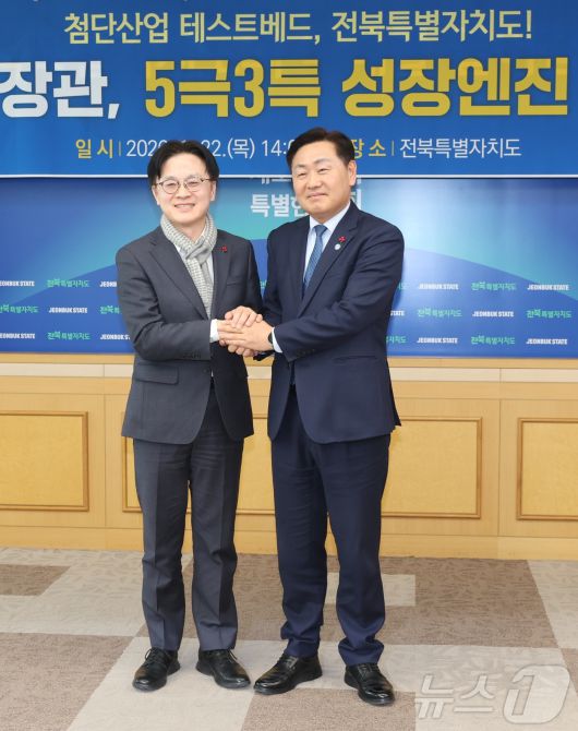(전주=뉴스1) 유경석 기자 = 김정관 산업부 장관(왼쪽)이 22일 전북 전주시 전북특별자치도청에서 열린 5극3특 성장엔진 현장 간담회에 앞서 김관영 전북도지사와 기념촬영을 하고 있다. 2026.1.22/뉴스1Yks919@news1.krCopyright ⓒ 뉴스1. All rights reserved. 무단 전재 및 재배포, AI학습 이용 금지.