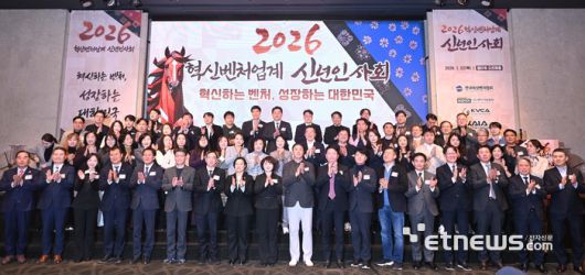 2026 혁신벤처업계 신년인사회가 22일 서울 서초구 엘타워에서 열렸다. 한성숙 중소벤처기업부 장관, 성미숙 한국여성벤처협회장, 송병준 벤처기업협회장, 강병준 전자신문 대표 등 참석자들이 기념촬영 하고 있다. 박지호기자 jihopress@etnews.com [Copyright © 전자신문. 무단전재-재배포금지]