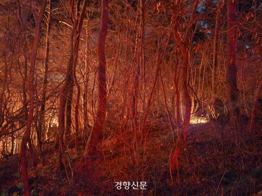 소방대원들은 새벽 기온이 영하 7도 이하로 떨어진 탓에 소방호스가 얼어붙는 어려움을 감수하면서 산불진화에 나섰다.