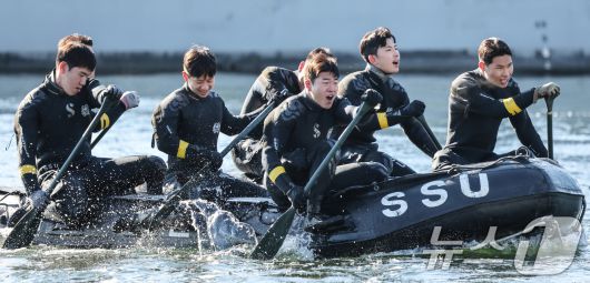 (창원=뉴스1) 윤일지 기자 = 전국적으로 맹추위가 기승을 부린 22일 경남 창원 진해 군항에서 해군 심해잠수사(SSU)들이 고무보트 패들링을 하며 혹한기 훈련을 하고 있다. (공동취재) 2026.1.22/뉴스1