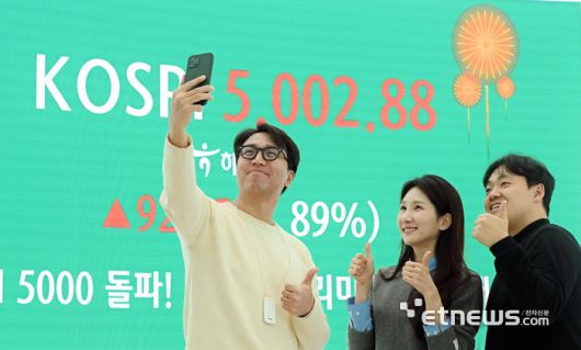 한국 증시가 사상 처음으로 '코스피 5000 시대'를 열었다. 2021년 3000포인트를 넘어선 지 5년 만에 달성한 쾌거다. 22일 서울 중구 하나은행 하나 인피니티 서울에서 직원들이 코스피 5000 돌파를 기념하며 셀피를 찍고 있다. 이동근기자 foto@etnews.com |