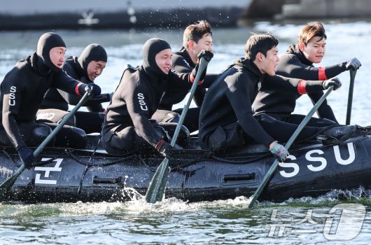(창원=뉴스1) 윤일지 기자 = 전국적으로 맹추위가 기승을 부린 22일 경남 창원 진해 군항에서 해군 심해잠수사(SSU)들이 고무보트 패들링을 하며 혹한기 훈련을 하고 있다. (공동취재) 2026.1.22/뉴스1yoonphoto@news1.krCopyright ⓒ 뉴스1. All rights reserved. 무단 전재 및 재배포, AI학습 이용 금지.