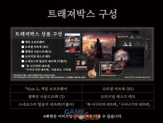 •『Nioh 3』 게임 소프트웨어 •오피셜 아트북 •셀렉션 사운드트랙 CD •오리지널 데스크 매트 •스네코스리 털공의 네쓰케(키홀더) •「복 너구리의 네쓰케」「구사나기의 네쓰케」다운로드 시리얼