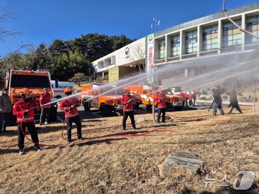 22일 오전 강원 강릉 동부지방산림청에서 산불진화대원이 고압 호스를 이용해 봄철 산불 대응 장비 시연을 하고 있다. 2026.1.22/뉴스1 윤왕근 기자 |