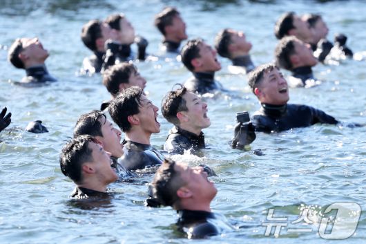 (창원=뉴스1) 윤일지 기자 = 전국적으로 맹추위가 기승을 부린 22일 경남 창원 진해 군항에서 해군 심해잠수사(SSU)들이 차가운 겨울 바다로 뛰어들어 군가를 부르며 혹한기 훈련을 하고 있다. (공동취재) 2026.1.22/뉴스1