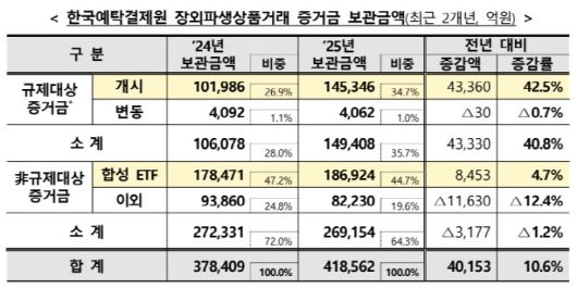 특히 금융회사 간 증거금 교환 의무가 적용되는 ‘규제 대상 증거금’ 증가 폭이 두드러졌다. 규제 대상 증거금 보관금액은 약 14조 9408억원으로 전년 말(약 10조 6078억원) 대비 약 4조 3330억원 늘어 제도 시행 이후 꾸준히 증가세를 나타냈다.