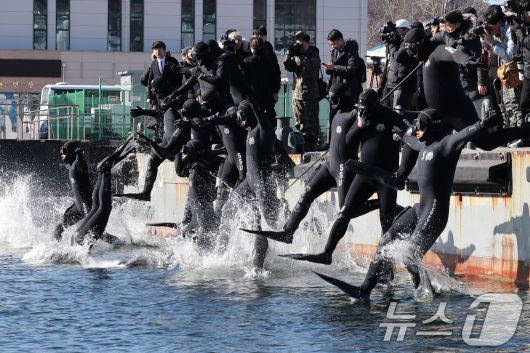 (창원=뉴스1) 윤일지 기자 = 전국적으로 맹추위가 기승을 부린 22일 경남 창원 진해 군항에서 해군 심해잠수사(SSU)들이 차가운 겨울 바다로 뛰어들며 혹한기 훈련을 하고 있다. (공동취재) 2026.1.22/뉴스1