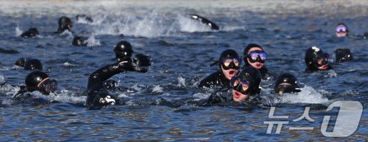 (창원=뉴스1) 윤일지 기자 = 전국적으로 맹추위가 기승을 부린 22일 경남 창원 진해 군항에서 열린 혹한기 내한훈련에서 해군 심해잠수사(SSU)들이 오리발 수영을 하고 있다. (공동취재) 2026.1.22/뉴스1