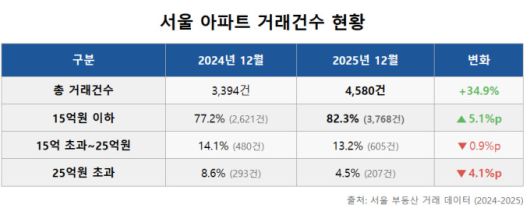 1년 전과 비교하면 변화는 더욱 뚜렷하다. 2024년 12월과 비교한 지난달 전체 거래 건수는 3394건에서 4580건으로 34.9% 증가했지만 구성은 크게 달라졌다. 15억원 이하 비중은 77.2%에서 82.3%로 5.1%p 상승한 반면 25억원 초과 비중은 8.6%에서 4.5%로 4.1%p 감소했다. 초고가 아파트 거래 건수도 293건에서 207건으로 29.4% 줄어들며 대출 규제의 직접적인 영향을 보여줬다.