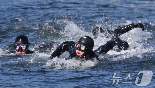 (창원=뉴스1) 윤일지 기자 = 전국적으로 맹추위가 기승을 부린 22일 경남 창원 진해 군항에서 열린 혹한기 내한훈련에서 해군 심해잠수사(SSU)들이 오리발 수영을 하고 있다. (공동취재) 2026.1.22/뉴스1