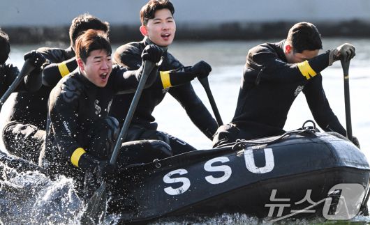 (창원=뉴스1) 윤일지 기자 = 해군 특수전전단 해난구조전대(SSU) 심해잠수사들이 22일 경남 창원 진해군항에서 열린 혹한기 내한 훈련 중 고무보트 패들링을 하고 있다. (공동취재) 2026.1.22/뉴스1yoonphoto@news1.krCopyright ⓒ 뉴스1. All rights reserved. 무단 전재 및 재배포, AI학습 이용 금지.