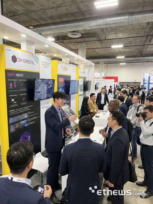 심투리얼 부스에는 시뮬레이션 상에서 시스템을 선제적으로 구축한 뒤 이를 실제 로봇이나 드론에 적용하려는 첨단 기술 기업들의 발길이 이어졌다. 스마트 공장 고도화를 목표로 하는 다양한 제조기업 관계자들이 방문해 실제 산업 현장과 가상 환경을 정교하게 결합하는 심투리얼 기술력에 높은 관심을 보였다.
