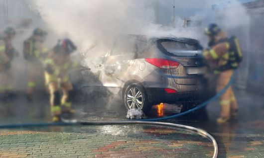 이 사고로 A씨가 얼굴에 화상을 입어 인근 병원으로 이송됐다. 또 A씨의 SUV가 전소되고, 옆에 주차된 통학버스 차량 외부가 그을렸다.