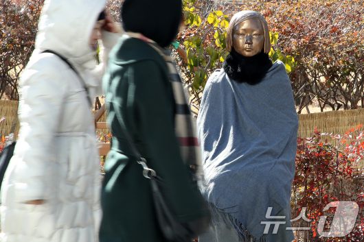 (대구=뉴스1) 공정식 기자 = 올겨울 최강 한파가 몰아친 22일 대구 중구 2.28기념중앙공원 앞 평화의 소녀상에 누군가 망토와 목도리가 둘러놓았다. 2026.1.22/뉴스1
