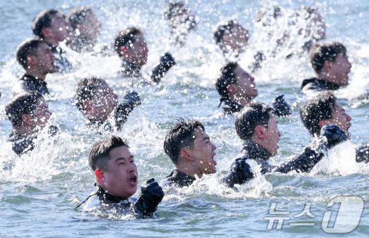 전국적으로 맹추위가 기승을 부린 22일 경남 창원 진해 군항에서 열린 혹한기 내한훈련에서 해군 심해잠수사(SSU)들이 오리발 수영을 하고 있다. (공동취재) 2026.1.22/뉴스1 ⓒ News1 윤일지 기자 |