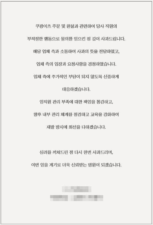 서울 강남구의 한 성형외과는 홈페이지에 사과문을 올려 “쿠팡이츠 주문 및 환불과 관련해 당사 직원의 부적절한 행동으로 물의를 일으킨 점 깊이 사과드린다”고 밝혔다.