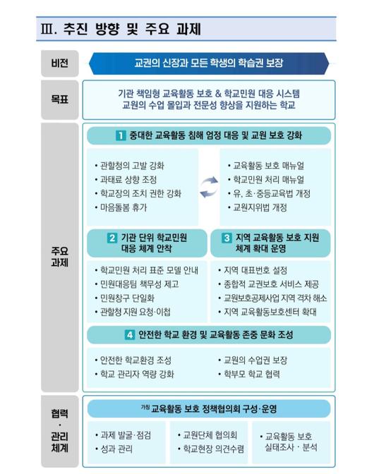 교육부와 대한민국교육감협의회는 이같은 내용을 담은 '학교민원 대응 및 교육활동 보호 강화 방안'을 22일 발표했다. 이는 이재명 정부 들어 교육 당국이 처음 내놓은 교권 보호 대책이다. 앞서 2023년 서이초 교사 사망 사건을 계기로 '교권회복 및 보호 강화 방안'을 마련하고 교권5법도 개정했지만 여전히 특이 민원 피해가 잇따르자 개별 교사가 아닌 기관 차원의 대응책을 강화한 것이다.