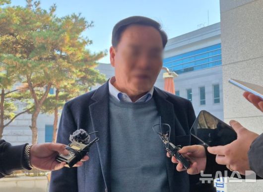 [청주=뉴시스] 연현철 기자 = 국민의힘 박덕흠 의원 보좌관 B씨가 25일 오전 청주지방법원 법정동 앞에서 취재진들의 질문에 답하고 있다. 2024.11.25. yeon0829@newsis.com |