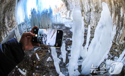 (연천=뉴스1) 이호윤 기자 = 연일 영하권의 매서운 한파가 이어진 22일 경기 연천군 신서면 경원선 폐터널에 역고드름이 솟아올라 장관을 펼치고 있다. 2026.1.22/뉴스1