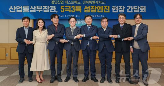 (서울=뉴스1) = 김정관 산업통상부 장관이 22일 오후 전북특별자치도청에서 김관영 전북특별자치도 도지사(왼쪽 다섯 번째)를 비롯한 관계자들과 기념촬영을 하고 있다. (산업통상부 제공. 재판매 및 DB 금지) 2026.1.22/뉴스1urodoct2@news1.krCopyright ⓒ 뉴스1. All rights reserved. 무단 전재 및 재배포, AI학습 이용 금지.