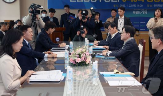 (서울=뉴스1) = 김정관 산업통상부 장관이 22일 오후 전북특별자치도청에서 김관영 전북특별자치도 도지사와 면담을 하고 있다. (산업통상부 제공. 재판매 및 DB 금지) 2026.1.22/뉴스1