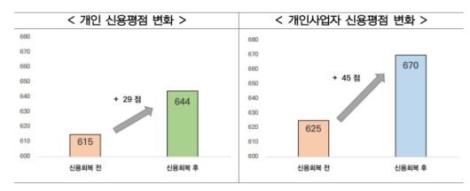 금융 거래 정상화 효과도 뚜렷했다. 신용 회복 이후 개인 11만 명, 개인사업자 6000명이 은행에서 신규로 대출을 이용한 것으로 파악됐다. 개인 3만 8000명은 신용카드를 새로 발급 받았다.