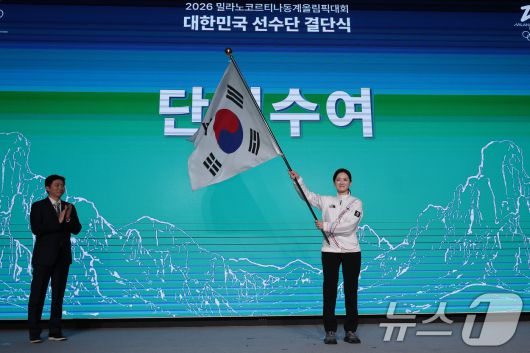 (서울=뉴스1) 김성진 기자 = 이수경 선수단장이 22일 서울 송파구 올림픽파크텔에서 열린 2026 밀라노코르티나 동계올림픽대회 결단식에서 유승민 대한체육회장에게 수여받은 단기를 흔들고 있다. 2026.1.22/뉴스1