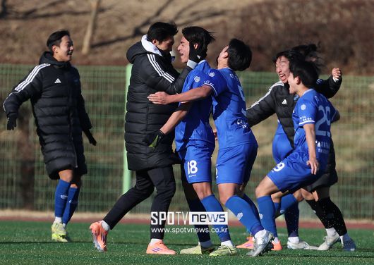 [스포티비뉴스=김천, 곽혜미 기자] 제22회 1,2학년 대학축구대회 중앙대와 상지대의 결승전이 22일 오후 경상북도 김천대학교 대운동장에서 열렸다. 역전골을 넣은 중앙대 김수민이 세리머니를 하고 있다.