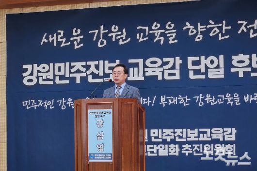 강원민주진보 교육감 후보 단일화 추진위원회는 22일 오전 11시 강원도농업인단체회관에서 단일화 후보 결과 발표 기자회견을 열고 강삼영 대표가 최종 후보로 선출됐다고 밝혔다.