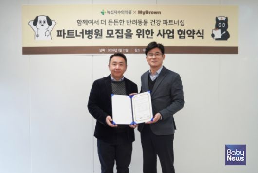 녹십자수의약품 나승식 대표(왼쪽)와 마이브라운 이용환 대표가 파트너병원 모집을 위한 사업협약(MOU) 체결 후 기념사진을 찍고 있다. ⓒ녹십자수의약품 |