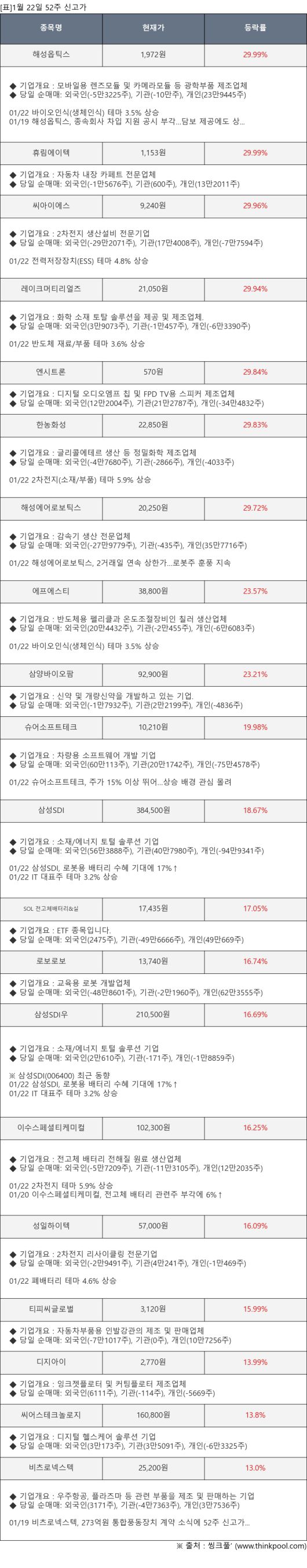 [서울=뉴스핌] 로보뉴스 = 1월 22일, 인공지능 투자비서 ‘AI라씨로’는 52주 신고가가 발생한 해성옵틱스(076610), 휴림에이텍(078590) 등의 최근 동향을 분석해서 발표했다.