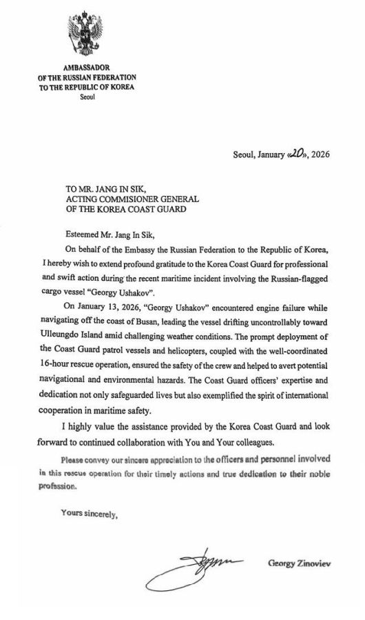 러시아 측은 서한에서 “악천후 속에서도 16시간에 걸쳐 이어진 해양경찰의 전문적이고 헌신적인 조치에 대해 깊은 감사의 뜻을 전한다“며 “한국 해양경찰의 대응이 자국 선원들의 안전을 확보했을 뿐 아니라 국제 해상 안전을 위한 책임 있는 협력의 모범이 됐다”고 했다.