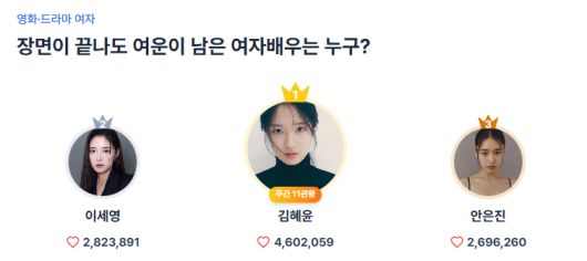 이번 투표에서 김혜윤은 4,602,059표를 얻으며 지지를 받았다. 장르와 플랫폼을 넘나들며 존재감을 쌓아온 그의 행보가 팬들의 선택으로 다시 한번 증명된 셈이다.