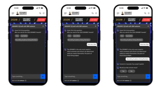 그래미 IQ는 에이전틱 AI 기술을 적용해 레코딩 아카데미가 보유한 방대한 음악 산업 데이터를 인터랙티브 퀴즈 형태로 구현한 서비스다. IBM의 대규모 언어 모델(LLM)인 ‘그래니트(Granite) 3.0’을 포함한 왓슨x 기술이 핵심 엔진으로 탑재됐다. 팬들은 이를 통해 그래미의 축적된 역사 데이터를 기반으로 생성된 질문을 풀며 자신의 음악적 지식을 시험하고 실시간 리더보드를 통해 경쟁할 수 있다.