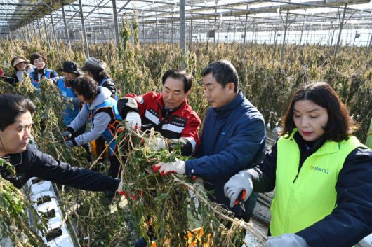 이날 자원봉사자들은 한파특보가 이어지는 추운 날씨 속에서도 시설하우스 내 고사된 토마토줄기 정리와 수확 잔여물 처리 등을 진행하며 구슬땀을 흘렸다.