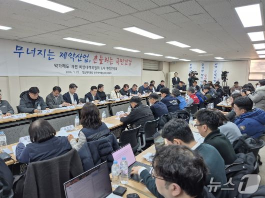 제약바이오 산업 비상대책위원회와 각 기업 노동조합위원장이 모여 '약가 제도' 개편 전면 재검토를 촉구하기 위한 논의를 하고 있다.2026. 1. 22/뉴스1 황진중 기자 |
