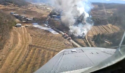 불은 바람을 타고 인근 야산으로 번지면서 소방당국은 헬기 8대와 인력을 투입해 진화 작업을 벌이고 있다.