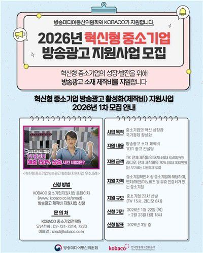 방미통위는 오늘(22일) 2026년 혁신형 중소기업 방송 광고 지원 사업 공모를 다음달(2월) 23일까지 진행한다고 밝혔습니다.
