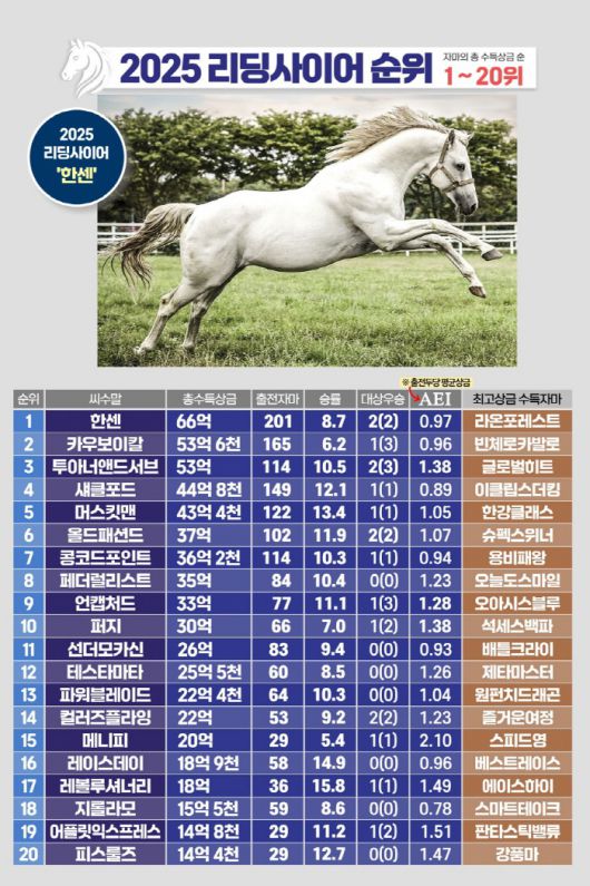 한센은 2025년에도 자마들의 다승 활약에 힘입어 리딩사이어를 지켜냈다. 200두가 넘는 자마들이 단·중거리 경주에 고르게 출전하며 안정적인 상금 누적을 이끌었다. 자마 평균상금(AEI)이 1을 넘지 못한 점은 아쉽지만 하위 등급부터 상위 등급까지 폭넓은 활약을 펼쳤다는 점이 강점이다.