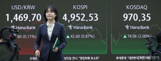 (서울=뉴스1) 박지혜 기자 = 코스피가 장중 사상 처음 5000선을 돌파한 뒤 오름폭을 줄여 4950대에 장을 마친 22일 오후 서울 중구 하나은행 본점 딜링룸 현황판에 코스피지수 종가가 나타나고 있다. 이날 코스피는 전장보다 42.60포인트(0.87%) 오른 4,952.53에 장을 마쳤다. 2026.1.22/뉴스1 Copyright (C) 뉴스1. All rights reserved. 무단 전재 및 재배포, AI학습 이용 금지. /사진=(서울=뉴스1) 박지혜 기자 |
