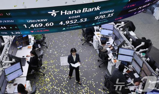 (서울=뉴스1) 박지혜 기자 = 코스피가 장중 사상 처음 5000선을 돌파한 뒤 오름폭을 줄여 4950대에 장을 마친 22일 오후 서울 중구 하나은행 본점 딜링룸 현황판에 코스피지수 종가가 나타나고 있다. 이날 코스피는 전장보다 42.60포인트(0.87%) 오른 4,952.53에 장을 마쳤다. 2026.1.22/뉴스1