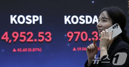 (서울=뉴스1) 박정호 기자 = 22일 오후 서울 영등포구 여의나루로 KRX 한국거래소 서울사무소 현황판에 종가가 나오고 있다. 장중 5000포인트를 넘겼던 코스피는 전 거래일 대비 42.60포인트(0.87%) 오른 4952.53, 코스닥은 19.06포인트(2.00%) 오른 970.35로 장을 마쳤다. 오후 3시 30분 서울외환시장에서 달러·원 환율은 전일 오후 3시 30분 주간종가 대비 1.4원 내린 1469.9원을 기록했다. 2026.1.22/뉴스1