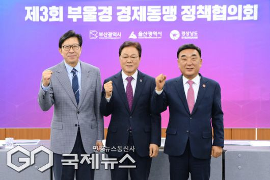 (오른쪽부터: 박형준 부산시장, 박완수 경남도지사, 김두겸울산기장이 지난해 4월, 기자회견장에서 상생협력을 다짐하며 기념촬영 하고 있다)/제공=국제뉴스 |