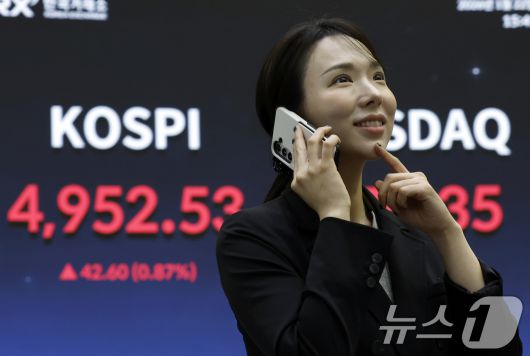 (서울=뉴스1) 박정호 기자 = 22일 오후 서울 영등포구 여의나루로 KRX 한국거래소 서울사무소 현황판에 종가가 나오고 있다. 장중 5000포인트를 넘겼던 코스피는 전 거래일 대비 42.60포인트(0.87%) 오른 4952.53, 코스닥은 19.06포인트(2.00%) 오른 970.35로 장을 마쳤다. 오후 3시 30분 서울외환시장에서 달러·원 환율은 전일 오후 3시 30분 주간종가 대비 1.4원 내린 1469.9원을 기록했다. 2026.1.22/뉴스1