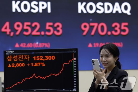 (서울=뉴스1) 박정호 기자 = 22일 오후 서울 영등포구 여의나루로 KRX 한국거래소 서울사무소 현황판에 종가가 나오고 있다. 장중 5000포인트를 넘겼던 코스피는 전 거래일 대비 42.60포인트(0.87%) 오른 4952.53, 코스닥은 19.06포인트(2.00%) 오른 970.35로 장을 마쳤다. 오후 3시 30분 서울외환시장에서 달러·원 환율은 전일 오후 3시 30분 주간종가 대비 1.4원 내린 1469.9원을 기록했다. 2026.1.22/뉴스1