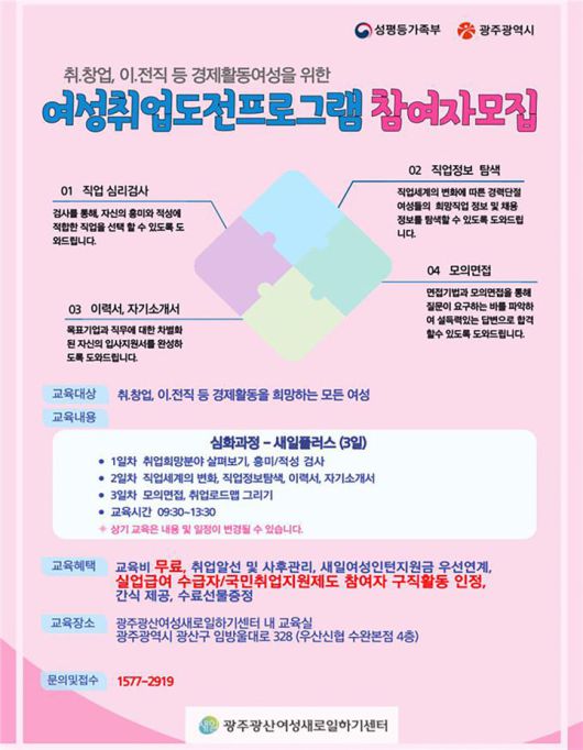 집단상담 여성취업도전프로그램 참여 신청은 광주광산여성새로일하기센터 홈페이지 등을 통해 할 수 있다.