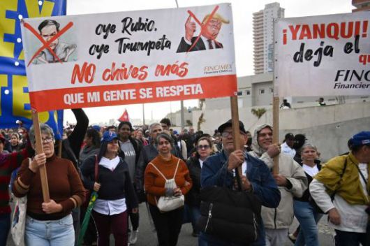 지난 16일(현지시간) 쿠바 아바나 미국 대사관 앞에서 시위가 열린 가운데 쿠바인들이 도널드 트럼프 미국 대통령과 마코 루비오 국무부 장관에 반대하는 현수막을 들고 있다. AFP연합뉴스 |