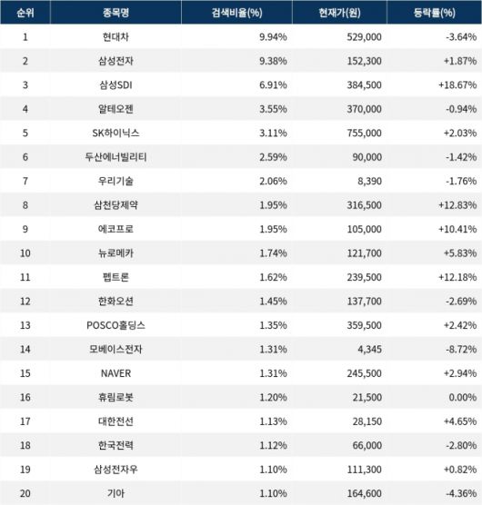 검색비율 2위의 삼성전자(005930)는 1.87% 상승 마감했다. 검색비율 3위의 삼성SDI(006400)는 18.67% 급등했다. 검색비율 4위 알테오젠(196170)은 0.94% 하락했다. 검색비율 5위 SK하이닉스(000660)는 2.03% 상승했다.